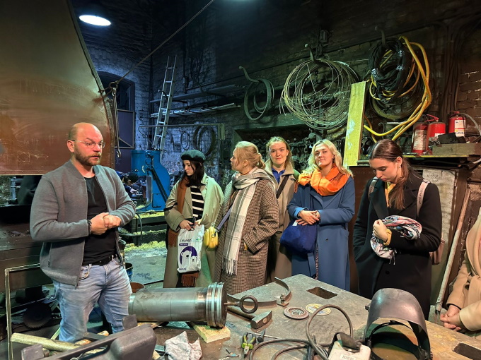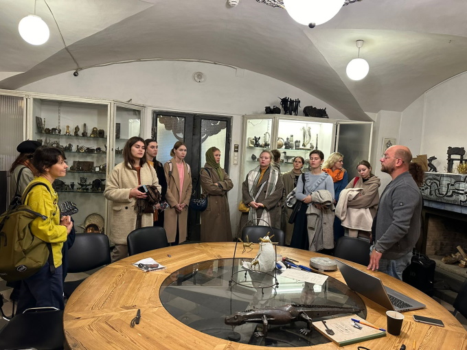 Также была проведена экскурсия по кафедре Архитектурно-декоративной пластики, в ходе которой студенты посетили кузнечную мастерскую, узнали об особенностях основных технологий обработки металла, которые возможно применять в монументальном искусстве, таких как: выколотка, гальваника, просечка, литье, ковка и кузнечная сварка.