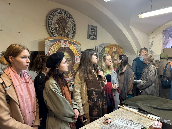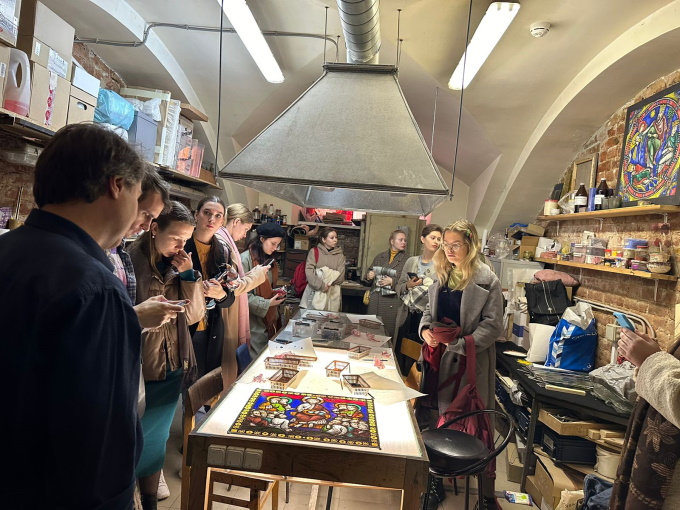 В ходе встречи была проведена обзорная экскурсия по кафедре монументально-декоративной живописи СПГХПА с посещением таких мастерских как: витражная, мозаичная, энкаустики, живописи и рисунка. Особое внимание было уделено мастерской горячей эмали, где студентам были показаны как студенческие работы, так и работы ведущих художников-эмальеров не только российских, но и зарубежных.