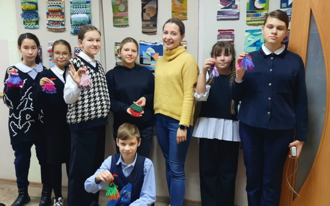 Ребята выполнили сувенир-брелок, изучив нескольких основных переплетений ручного ткачества. Каждый составил свою цветовую гамму и простую композицию изделия. Мастер-класс завершился памятным фото.