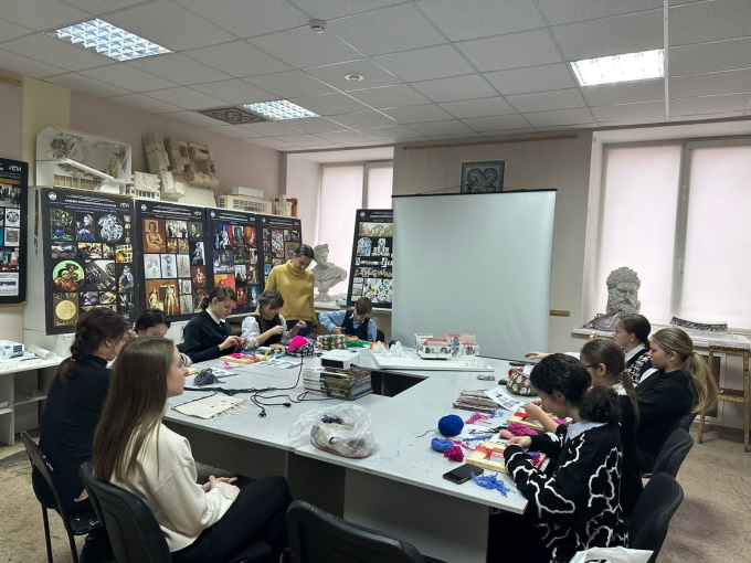 20 октября 2023 г. на кафедре монументального искусства прошёл мастер-класс для школьников в рамках программы «Билет в будущее». Ребята из 279 школы посетили наши аудитории, посмотрели как идёт работа над творческими и учебными проектами. Они заглянули в классы по рисунку и живописи, витражную, эмальерную и мозаичную мастерские. После небольшой экскурсии школьники попробовали себя в технике ткачества. Дисциплина «Гобелен» появилась на кафедре сравнительно недавно и дополнила ряд специальных предметов.
