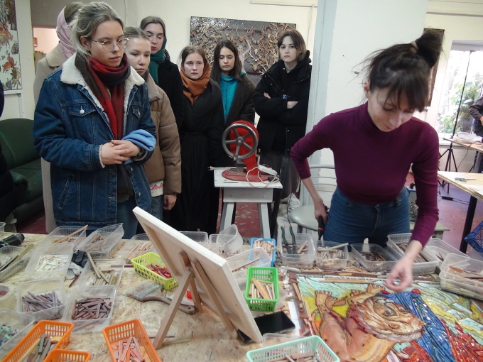 26 октября 2023 г. для студентов групп 2-ДД-4 и 4-ДД-4 кафедры монументального искусства доцентом А. Н. Гординым и ст. преподавателем Я. А. Александровой была организована производственная экскурсия в мастерскую художника-монументалиста Олега Петровича Костенко. В ходе экскурсии студенты познакомились: