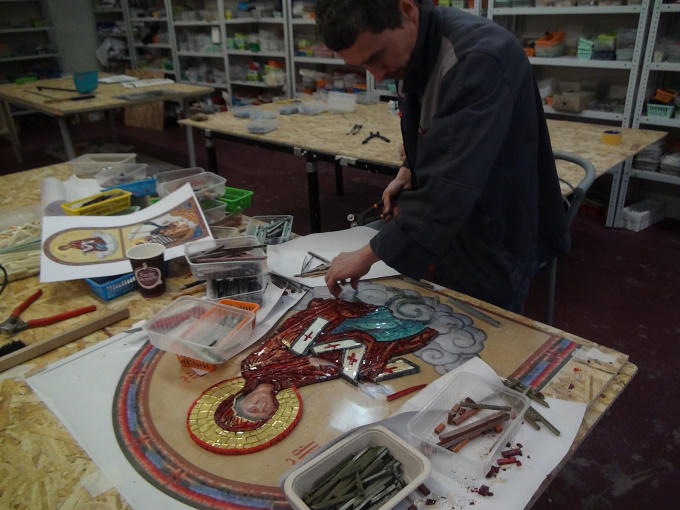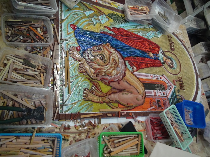 Особенно интересно было наблюдать, как мастер подкалывает смальту по рисующей линии изображения согласно эскизу.
