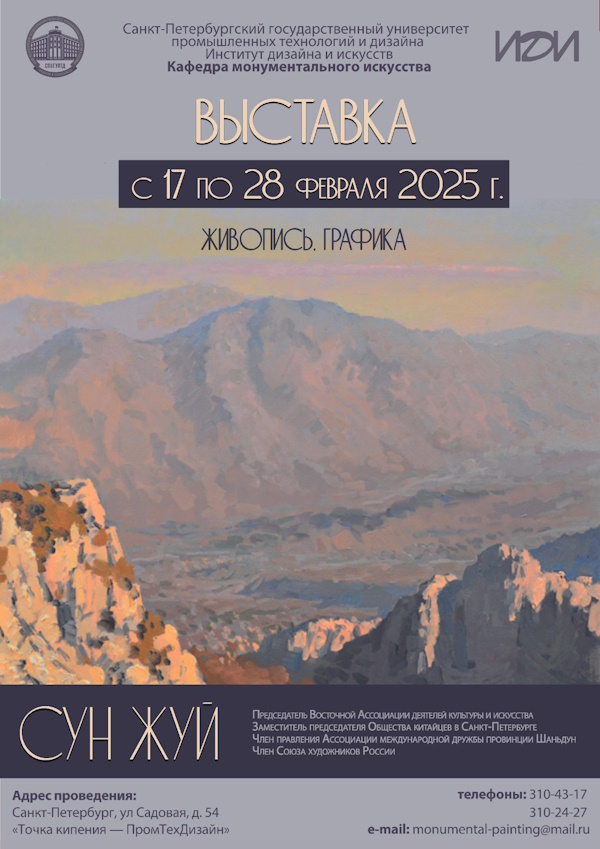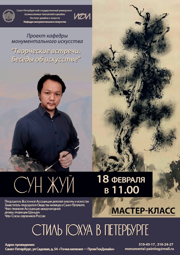 18 февраля 2025 г. в Точке кипения «Пром-Тех-Дизайн» в рамках проекта кафедры монументального искусства «Творческие встречи. Беседы об искусстве» состоится открытие выставки и мастер-класс «Стиль гохуа в Петербурге» китайского художника Сун Жуя.