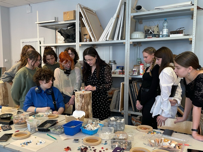 Преподаватель разъяснила им перспективы и возможности обучения на кафедре монументального искусства. Учащиеся колледжа вдохновились традиционными прикладными техниками и собираются прийти вновь!