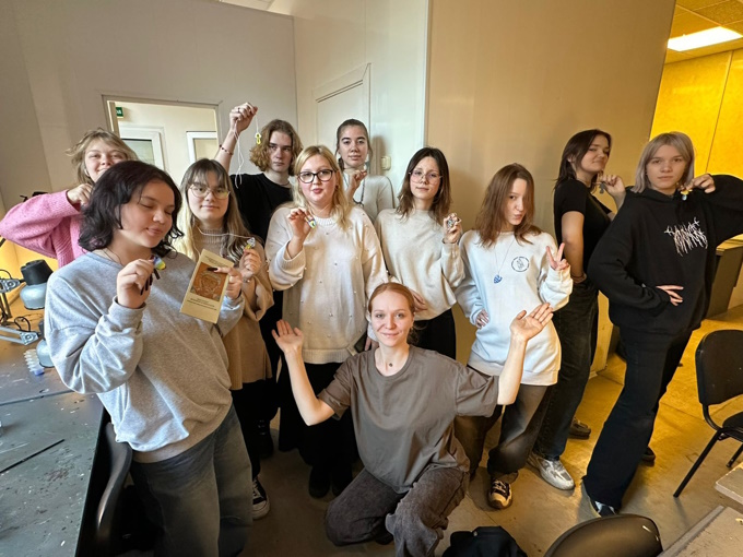 Студенты также узнали много интересного о технике горячей эмали. Под руководством М. С. Давыдовой была выполнена творческая работа: ребята придумали авторское декоративное произведение в различной цветовой гамме. Было заметно, что участники стараются и ответственно подходят даже к миниатюрным работам. В итоге каждый студент получил в подарок стильный кулон, выполненный своими руками. Участники мероприятия выразили желание посетить кафедру снова!