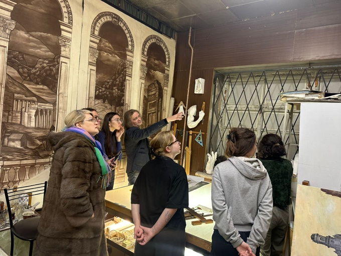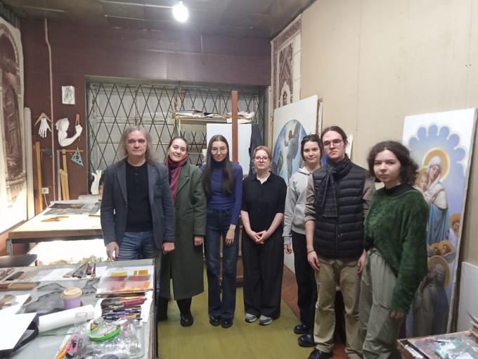 03 декабря 2025 г. студенты кафедры монументального искусства под руководством преподавателей: зав. кафедрой, доцента Д. О. Антипиной и ассистента Е. Г. Кольцовой, посетили мастерскую известного петербургского художника по витражу, Сергея Александровича Хвалова.