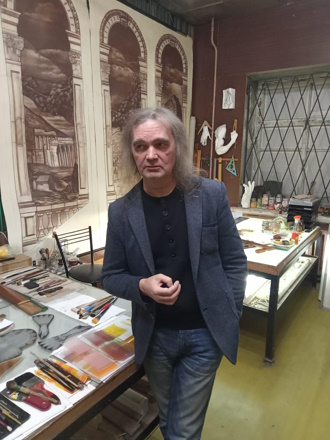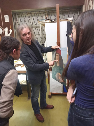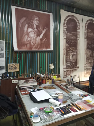 Сергей Александрович познакомил студентов гр. 1-ДД-2 с обстановкой мастерской, профессиональными материалами и оборудованием, а также картонами к осуществленным работам. Ребята почувствовали творческую атмосферу и узнали для себя много нового.