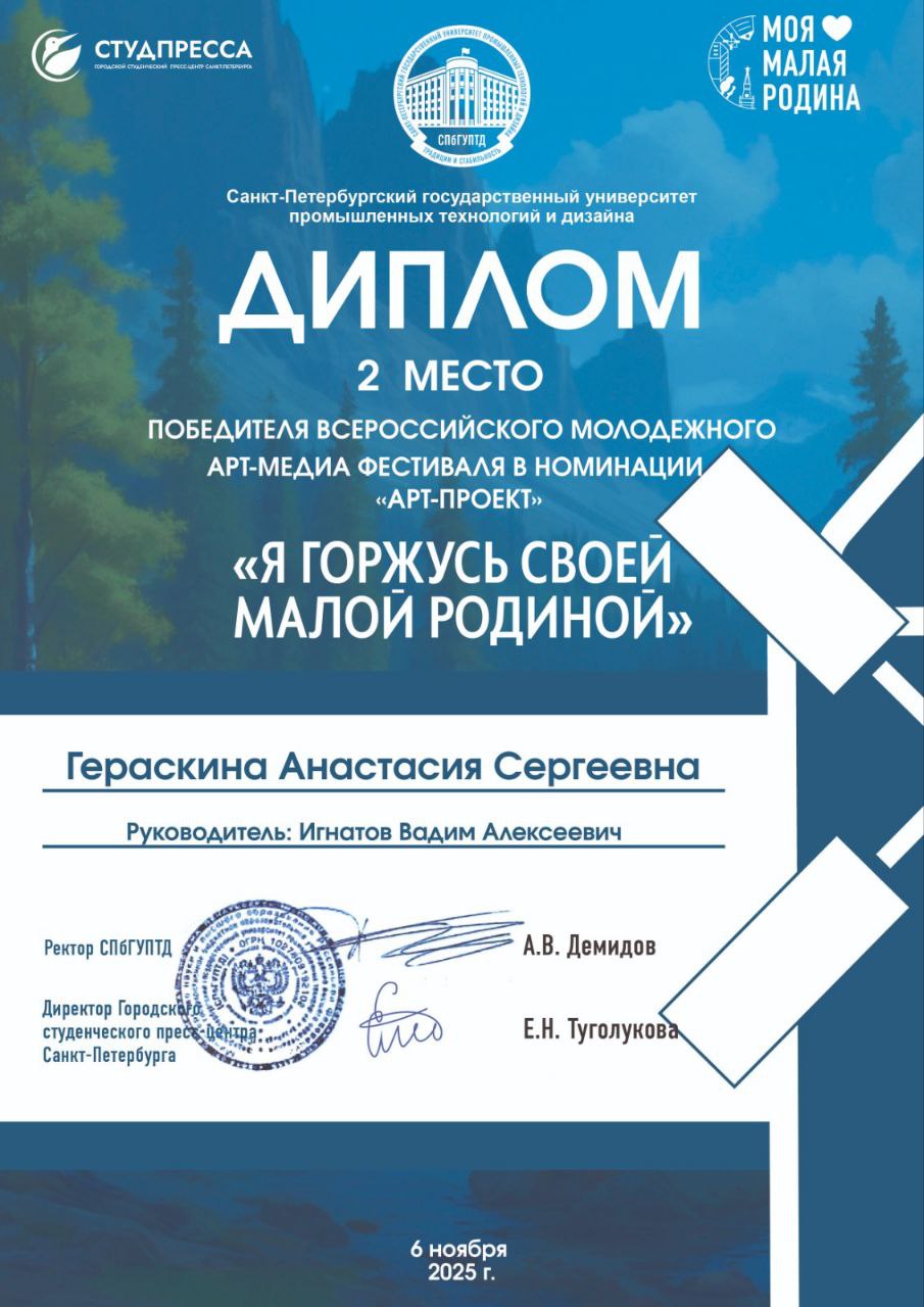 Поздравляем Победителя и Призёра Всероссийского молодёжного арт-медиа фестиваля «Я горжусь своей малой Родиной» в номинации «Арт-Проект» студенток ИДПС: Гарабаджиу Михаелу – 1 место и Гераскину Анастасию – 2 место!