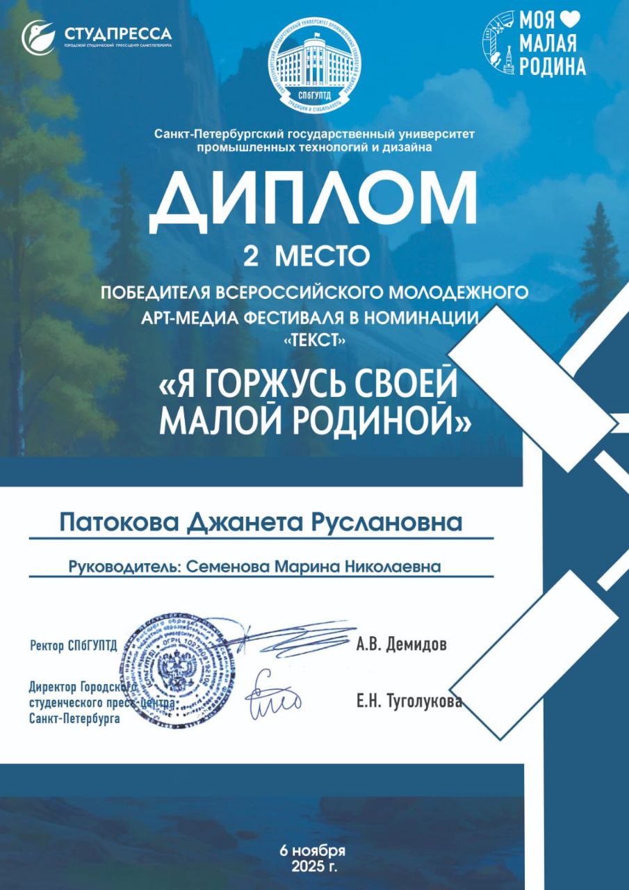Поздравляем Победителя и Призёра Всероссийского молодёжного арт-медиа фестиваля «Я горжусь своей малой Родиной» в номинации «Текст» студенток ИДПС: Лоншакову Киру – 1 место и Патокову Джанету – 2 место!