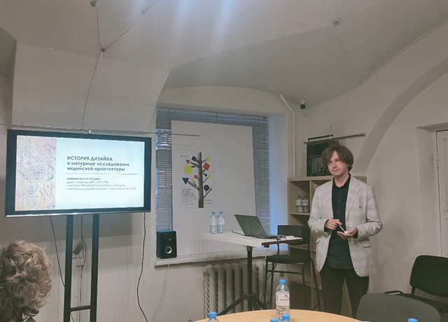 Доцент Лобанов Е.Ю. выступил с докладом о натурных исследованиях индийской архитектуры, проведённых во время командировок в Индию в 2023 и 2025 годах. Он продемонстрировал примеры графического анализа планировок зданий и орнаментальных паттернов, а также рассказал о фрактальных принципах формообразования и их связи с индийской космологией и системой Васту.