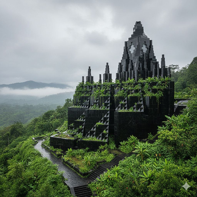 Черный фрактальный архитектон, придуманный доцентом Е.Ю. Лобановым, — загадочное самоподобное сооружение, сконструированное на основе повторения базовых супрематических форм в разном масштабе. Это размышление о геометрических кодах архитектуры и переосмысление раннего абстракционизма в эпоху нейросетей.