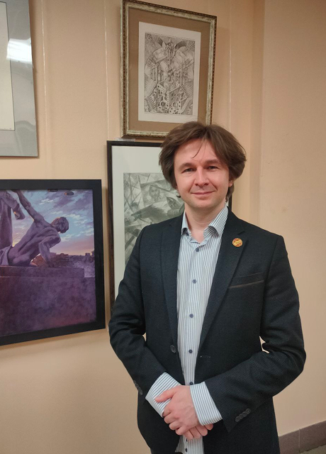 - доцент кафедры дизайна интерьера и оборудования Лобанов Евгений Юрьевич показал новую графическую фантазию «Мультипространство солидаризма» с архитектурными мотивами в сложном сочетании перспективных и аксонометрических проекций.