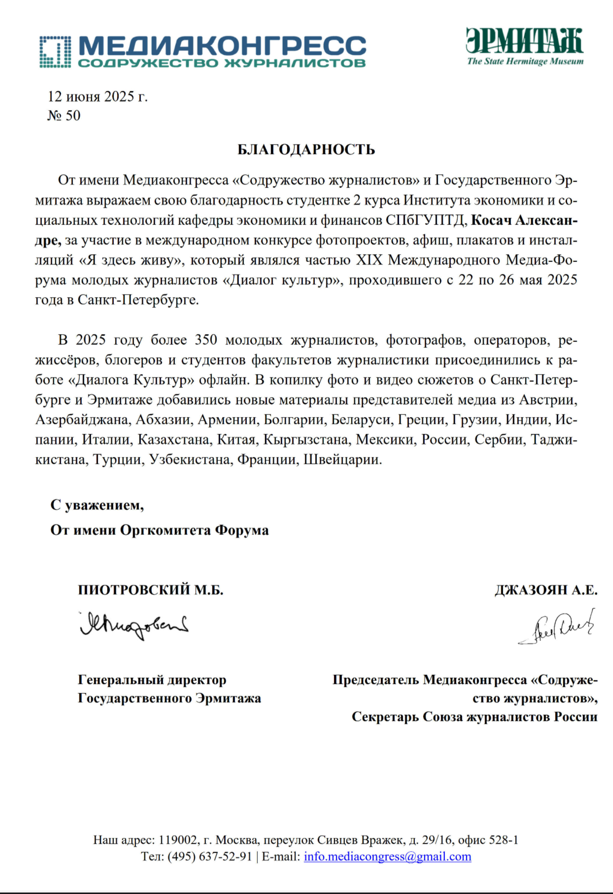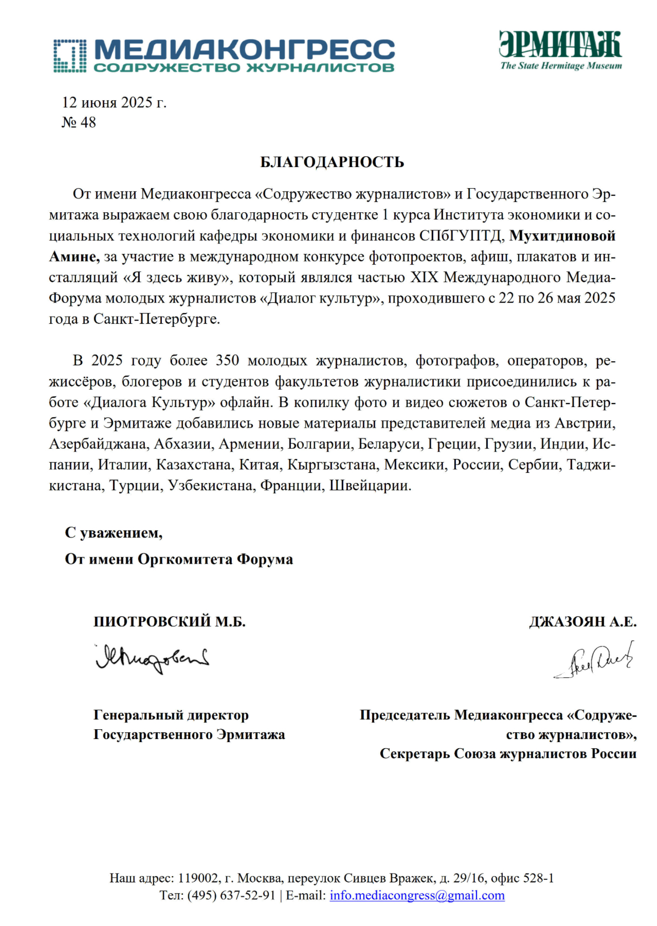Благодарности за участие от имени Организационного комитета Форума Михаила Борисовича Пиотровского, генерального директора Государственного Эрмитажа, и Ашота Егишеевича Джазояна, председателя Медиаконгресса «Содружество журналистов», секретаря Союза журналистов России.