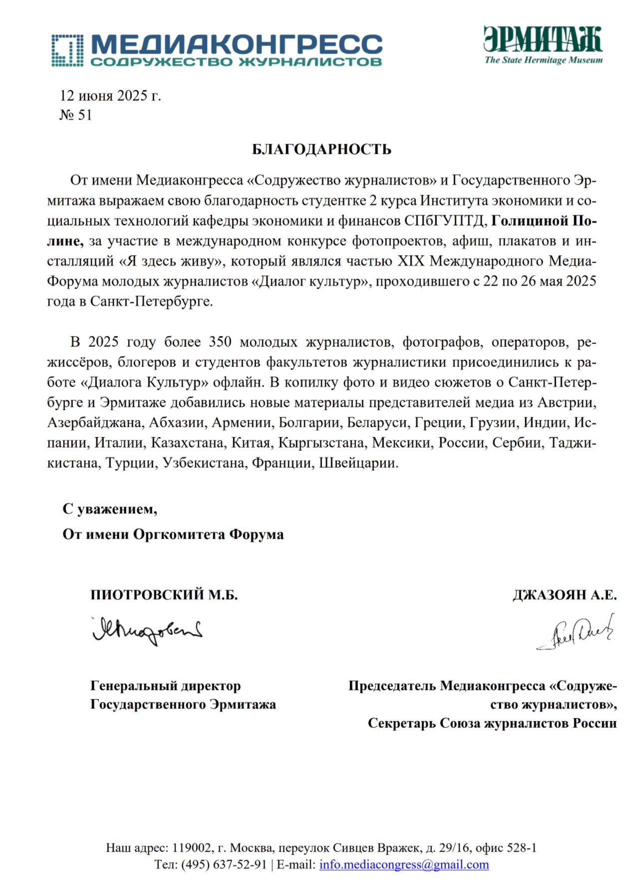 - Полина Голицина (группа 2-ЭД-20) в номинации Короткие видеоролики на тему «Встреча сердец под брендом России».