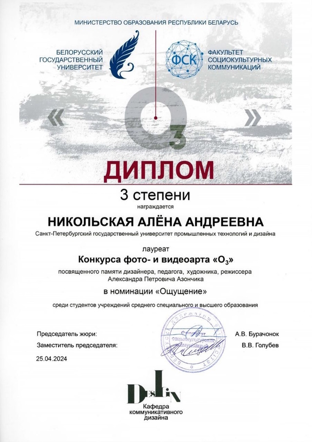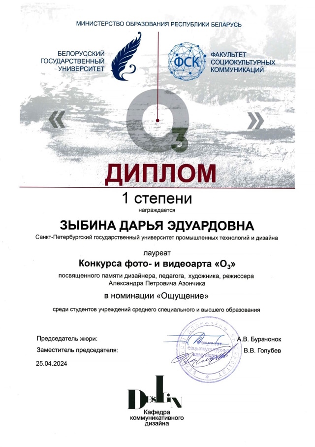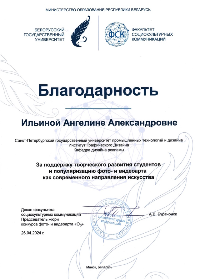 С 25 марта по 25 апреля 2024 года в рамках Международной научно-практической конференции ФСК БГУ «Актуальные проблемы дизайна и дизайн-образования» прошёл ежегодный конкурс фото- и видеоарта, организованный Белорусским государственным университетом. Цель конкурса – выявить и поощрить авторские социокультурные, технологические и художественные достижения в области фото- и видеоискусства, визуальной культуры и дизайн-образования.