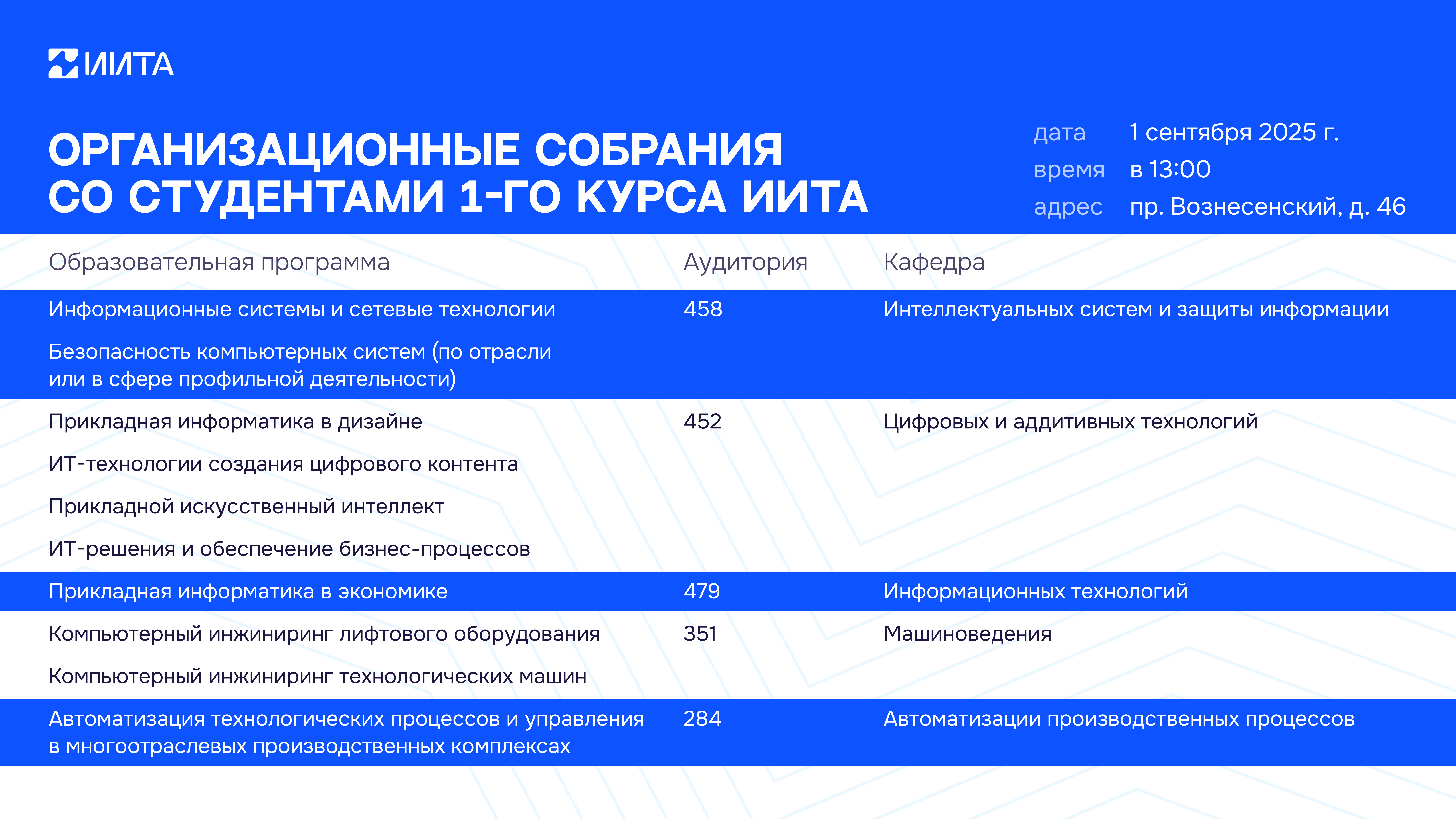 01 сентября 2025 года в 13:00 пройдёт организационное собрание для студентов 1-ого курса по адресу пр. Вознесенский д. 46.