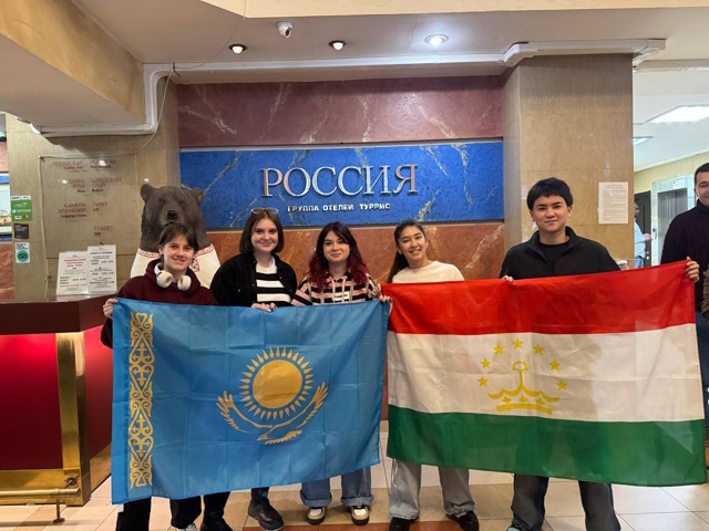 В делегацию СПбГУПТД вошли студентки вуза, которые приехали учиться в Россию из Казахстана, Дарья Гостева, Евгения Покидова и Виолетта Романенко, а также двое первокурсников из Таджикистана — Мехрангез Хакимова и Фахриддин Джалолов.