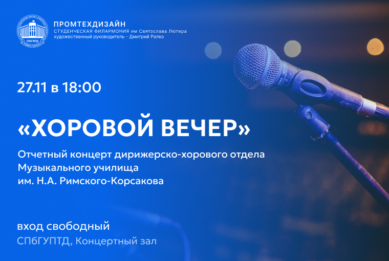 Студенческая филармония им. Святослава Лютера приглашает на хоровой вечер, отчетный концерт дирижерско-хорового отдела Музыкального училища им. Н.А. Римского-Корсакова.