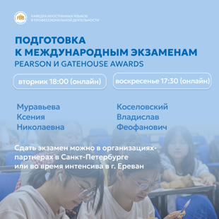 Кроме того, у студентов, которые планируют продолжить обучение за границей или устроиться там на стажировку, есть возможность записаться на подготовку к международным экзаменам Pearson и Gatehouse Awards, признанным университетами и работодателями по всему миру. По итогу обучения студенты сдают экзамены в партнерских центрах в Петербурге и Ереване.