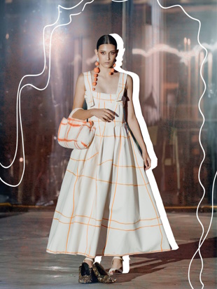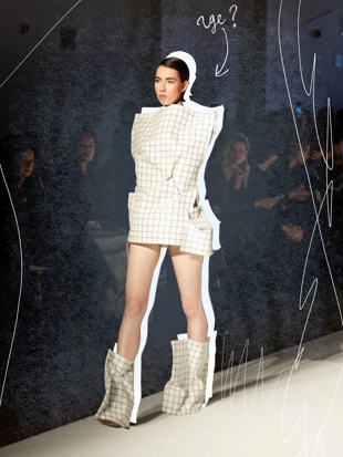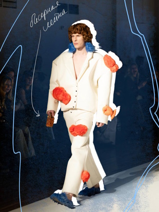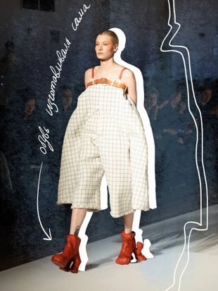 Коллекция Марии сочетает в себе авангардную современность и советские мотивы. В нее вошли огромные сумки-рыбки, гигантские брюки и футуристичные сандалии.