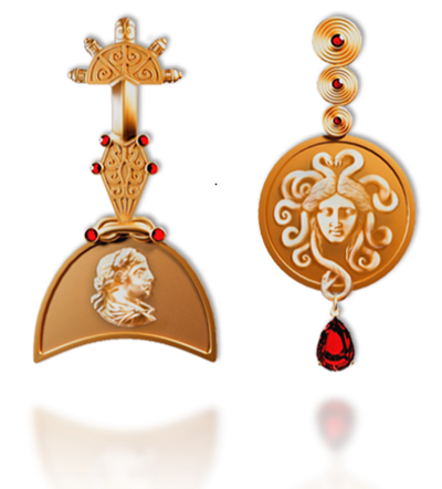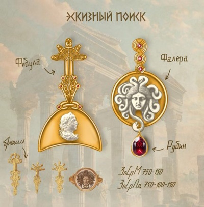Серьги, которые также вошли в парюру, были вдохновлены самой загадочной линией сюжета романа Булгакова, связанной с историческим портретом Понтия Пилата, римского прокуратора Иудеи. Для их создания студентка исследовала ювелирные украшения античного искусства. За основу образа серег взяты элементы исторических металлических украшений, служившие воинскими знаками отличия у римских легионеров — фибулы и фалеры.