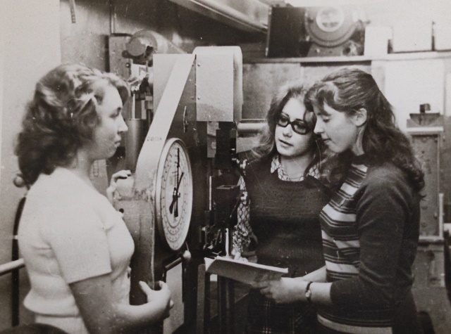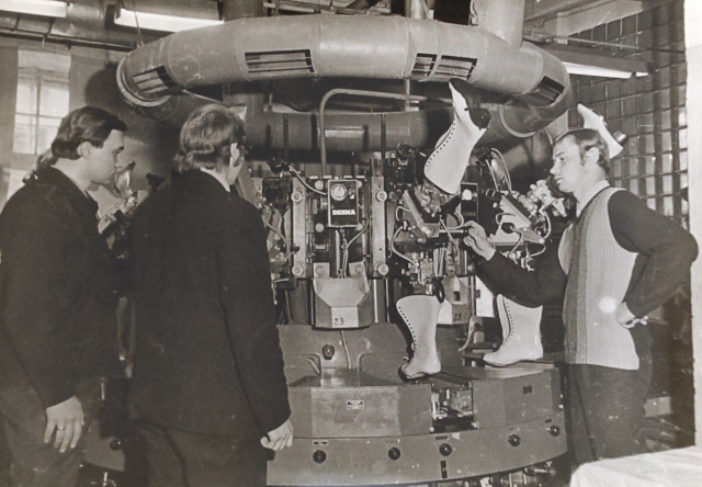 Студенты на занятиях в цехах фабрики «Скороход». Установка «Десма» для литья ПВХ низа обуви.