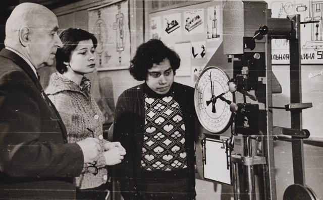 Профессор Павел Владимирович Мелентьев, руководитель СНО на кафедре сопротивления материалов со студентами возле установки для механических испытаний полимерных волокон.