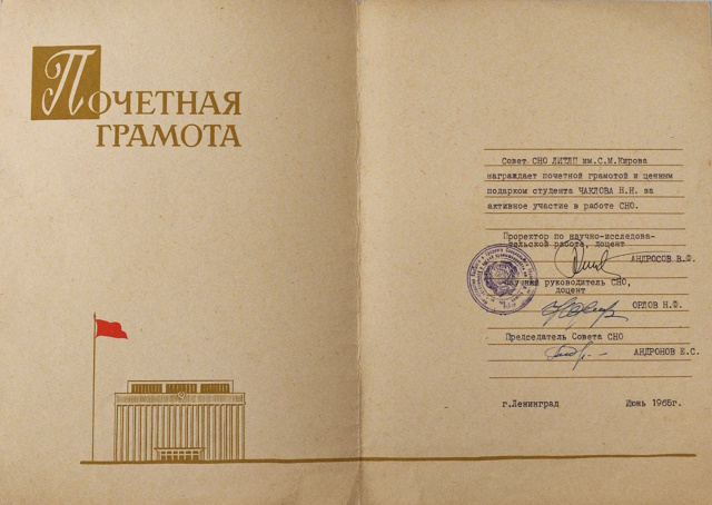Почетная грамота студента Н.Н. Чаклова за активное участие в СНО. 1965 год.