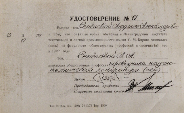 Удостоверение о присвоении профессии переводчика научно-технической литературы участника Студенческого бюро переводов.