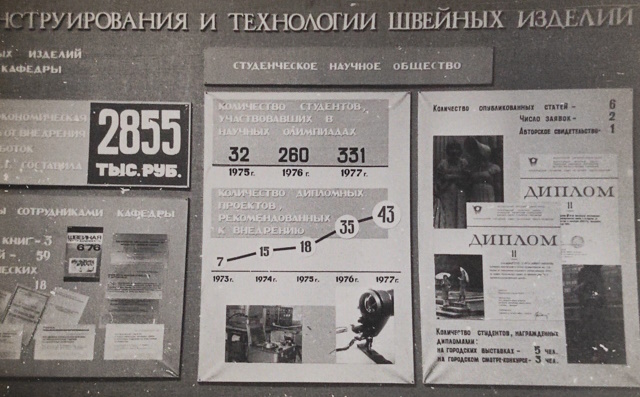 В 1978 году в павильонах «Ленэкспо» проходила выставка научно-технического творчества студентов «НТТС-78». Здесь экспонировалось 25 работ студентов-химиков, из них 7 награждены дипломами 1-й степени и 10 — дипломами 2-й степени. Успешна изобретательская деятельность студентов СНО: в 1978 году получено 6 положительных решений и одно авторское свидетельство по работам с участием студентов СНО. Студенты-швейники на НТТС-78 представили 83 экспоната. Шесть работ награждены дипломами 1-й степени, четыре работы — дипломами 2-й степени.