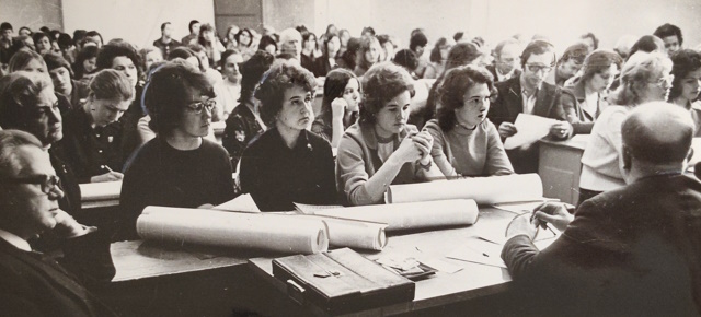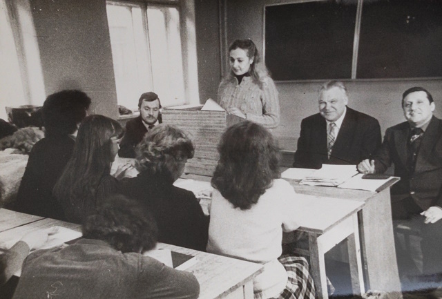 Выпускники кафедры конструирования и технологии швейных изделий на просмотре коллекций Студенческого дома моделей. 1970-е.