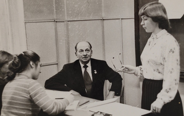 Научная конференция на кафедре технологии изделий из кожи. Проводит декан кожевенно-обувного факультета Петр Петрович Боткин.