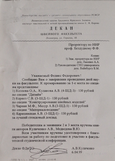 Служебная записка декана швейного факультета о награждении активных участников Дней науки.