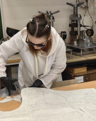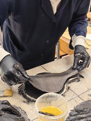На первом этапе студенты сосредоточились на подборе материалов и проектировании «бутерброда» — слоев будущего композита. В качестве армирующих слоев был выбран плотный стекломат, дополненный нетканым сотовым полиэфирным материалом для придания структуре объема. Для внешних декоративных слоев использовалась углеродная ткань саржевого переплетения. В качестве связующего применена эпоксидная смола общего назначения.