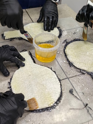 Первый день работы был посвящен кропотливому процессу ручной выкладки: студенты последовательно формировали слои композита, пропитывая каждый материал смолой.