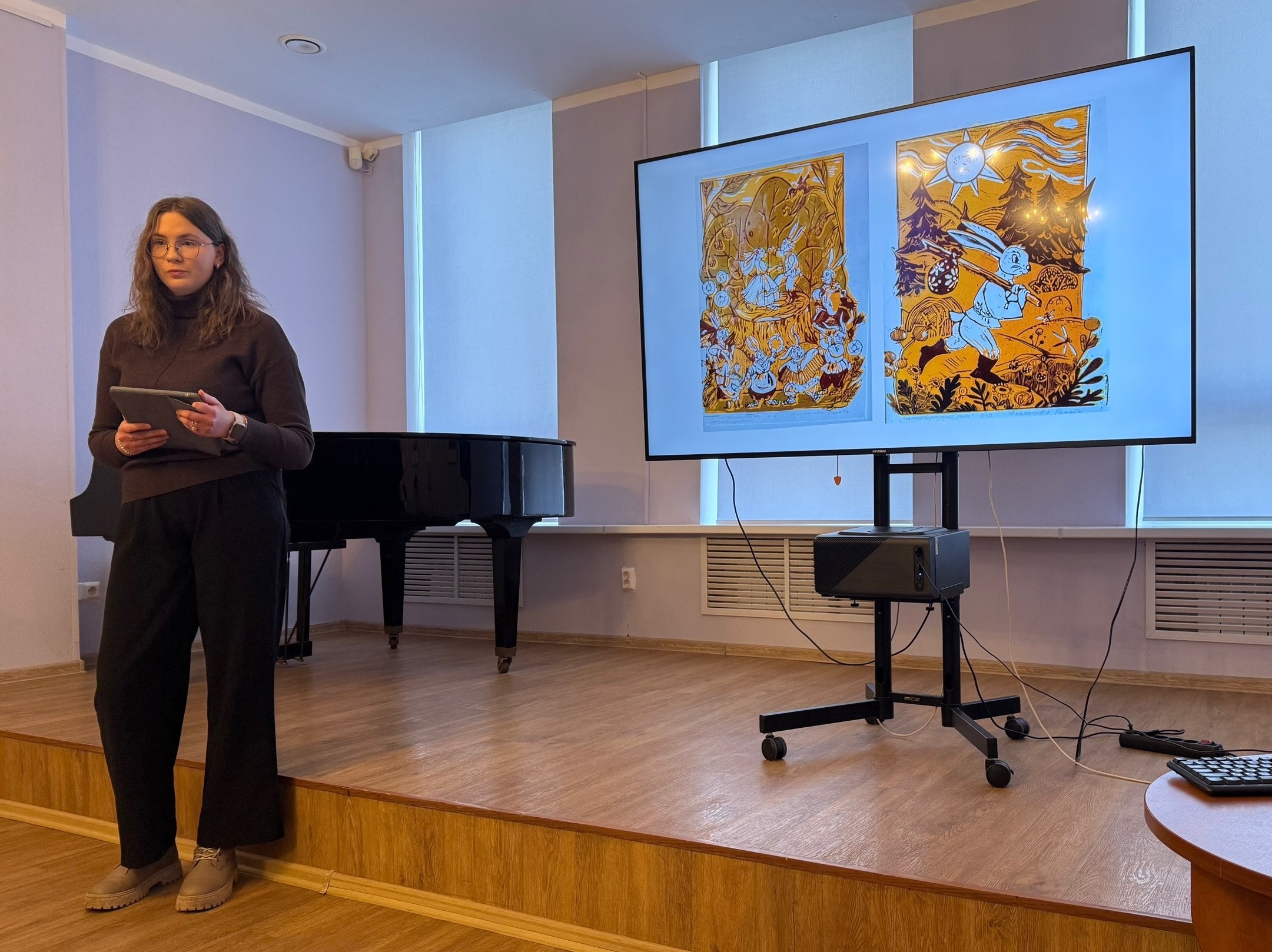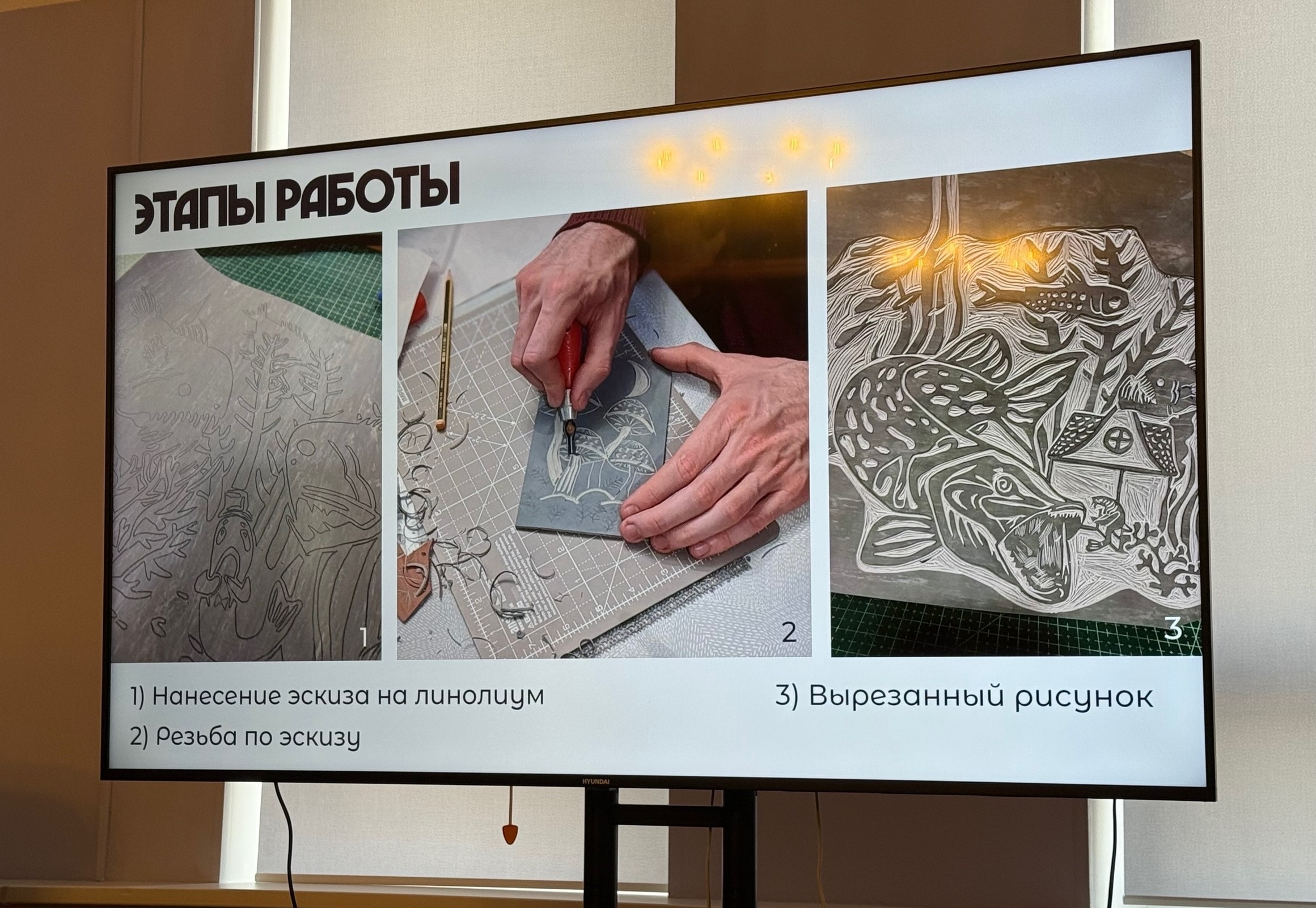 В рамках встречи студентки Полина Сукова и Валерия Цепелева презентовали процесс создания многоцветных линогравюр. Они продемонстрировали специфику этой техники, позволяющей добиваться чистоты линий, высокого контраста и характерной фактуры ручной печати, благодаря чему сатирические сюжеты обретают новую художественную выразительность.